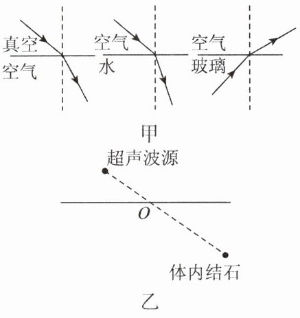 (4)现代医学中常用超声波击碎人体内的结石,超声波从空气中斜射入人体后也类似光一样要发生折射,如图乙所示,超声波进入人体击碎结石时,入射点应在O点的______(填“左侧”或“右侧”)。
