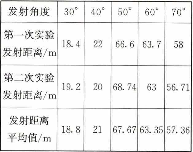 (3)【发射】在水量、气压相同时,探究发射角度对水火箭发射距离的影响,收集到的数据如下表: