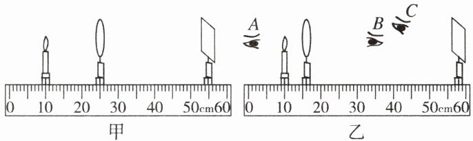 (3)如图乙所示,保持蜡烛位置不变,移动透镜至16 cm刻度线处,则人眼在图中______(填“A”“B”或“C”)处能观察到烛焰的像。