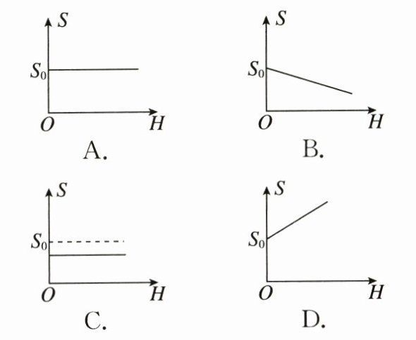 2. 如图所示,在烧杯正中心上方固定一打开的手电筒,光束向下投射到空烧杯底部,光束发散形成一个圆形光斑(图中虚线所示),此时圆形光斑的面积大小为$ S_0 $。现在往烧杯中缓慢注水,随烧杯内液面高度$ H $的增加,圆形光斑面积$ S $变化情况的大致图像是(