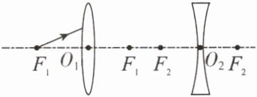 变式 在图中$,F_1$为凸透镜的焦点$,F_2$为凹透镜的虚焦点。完成光从左边射向凸透镜经折射后,再由凹透镜射出的完整光路。