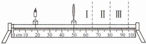 8. 小曹在做“探究凸透镜成像规律”的实验时,所使用的凸透镜焦距为 15 cm,如图所示,当把凸透镜固定在 50 cm 刻度线位置,蜡烛固定在 18 cm 刻度线位置时,光屏应在______(填“Ⅰ”“Ⅱ”或“Ⅲ”)区域内左右移动,才能在光屏上得到清晰的像。若得到清晰的像后,只将光屏和蜡烛的位置对调,则像的大小______(填“变小”“不变”或“变大”)。当光屏上的像清晰时,小曹把自己的近视眼镜放在凸透镜和蜡烛之间,发现光屏上的像变得模糊不清,她应该向______(填“靠近”或“远离”)凸透镜方向移动光屏,或者将蜡烛往______(填“右”或“左”)移,才可再次得到清晰的像。