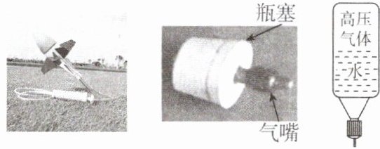 10. 水火箭升空的原理如下:在瓶中装适量的水,塞好瓶塞后放在发射架上,用打气筒向瓶内打气,瓶内上方气体压强达到一定程度时,高压气体将水和瓶塞从瓶口压出,瓶飞向高空。