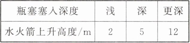 (2)实验后小明提出了问题:水火箭上升高度与什么因素有关呢?小明猜想:可能与瓶塞塞入深度有关;小军猜想:可能与瓶子的形状有关。你认为还可能与______有关(写出一点)。
