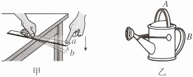 6. 如图甲所示,取一根钢尺,一端用左手按压在桌面上,右手的手指将露出桌面的一端下压至a、b两位置,在______(填“a”或“b”)位置时手指用力较大。这一实验现象可以说明:物体的______越大,产生的弹力就越大。如图乙所示,洒水壶有A、B两个把手,分别供提水、洒水时使用,这说明力的作用效果与力的______有关。