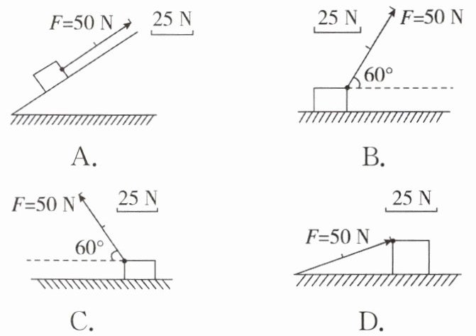4. 用50 N的力沿与水平面成$60^\circ$角斜向右上方拉物体,使之在水平面上运动,关于该拉力的图示正确的是( )
