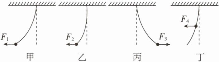 10. 为了探究力的作用效果与哪些因素有关,小王同学做了如下实验。如图所示,将一薄钢条上端固定,现分别用不同的力去推它,使其发生甲、乙、丙、丁各图所示的形变。图中$F_1= F_3= F_4>F_2$。