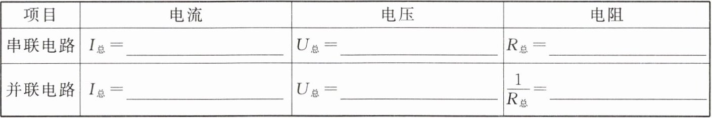 |串联电路|$I_{总}= $______|$U_{总}= $______|$R_{总}= $______|