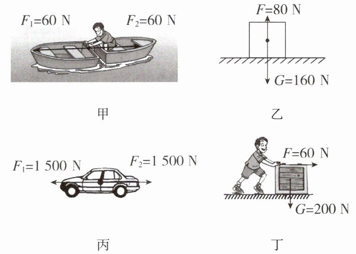 7. 分析图甲、乙、丙、丁中作用在物体上的两个力,其中图______中的作用力为平衡力,图______中的作用力为非平衡力,这是因为平衡力是______。分析可知,图甲中的两个力______,图丁中的两个力______。