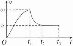 11. 某次演练中,直升机悬停于高空,一名伞兵(含伞)从直升机跳下后竖直降落,其速度$ v 与时间 t $的关系如图所示。在$ 0~t_1 $时间内,伞兵处于______(填“加速”“减速”或“匀速”)运动状态,此时伞兵受到的重力______(填“<”“=”或“>”)阻力;在______(填“$ t_1~t_2 $”或“$ t_2~t_3 $”)时间内,伞兵受到的阻力保持不变,此时受到的重力______(填“<”“=”或“>”)阻力。