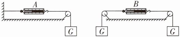 10. 如图所示,弹簧测力计和细线的重力及一切摩擦不计,物体质量为$ 2\ kg $,当物体静止不动时,弹簧测力计A和B的示数分别为($ g 取 10\ N/kg $)( )
