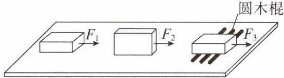 8. 在研究摩擦力时,小明同学用一块各侧面光滑程度完全相同的木块,在同一水平桌面上进行了三次实验。如图所示,当用弹簧测力计水平拉木块做匀速直线运动时,弹簧测力计三次示数$F_1$、$F_2$、$F_3$的大小关系为( )