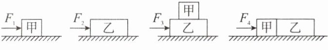 10. 如图所示,在同一水平面上,有表面粗糙程度相同、质量不同($m_{甲}<m_{乙}$)的甲、乙两个木块,按照图中四种方式放置,分别在水平推力$F_{1}$、$F_{2}$、$F_{3}和F_{4}$的作用下做匀速直线运动,则下列关系式正确的是( )