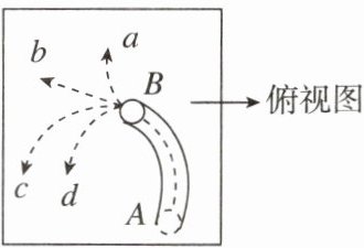 11. (8分)如图所示,水平桌面上有一弧形弯道。小钢球从A端滚入,若保持速度大小不变,从B端离开,它在AB段运动时,受力是否平衡?______(填“是”或“否”)。若它离开B端的瞬间,所有外力都消失,小钢球会沿着______(填“a”“b”“c”或“d”)方向运动。