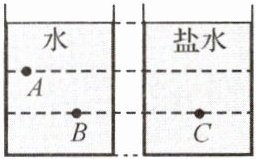 2. 如图所示,两容器中分别装有相同高度的水和盐水($\rho_{水}<\rho_{盐水}$),A、B、C三点液体的压强分别为$p_{A}$、$p_{B}$、$p_{C}$,它们的大小关系是( )