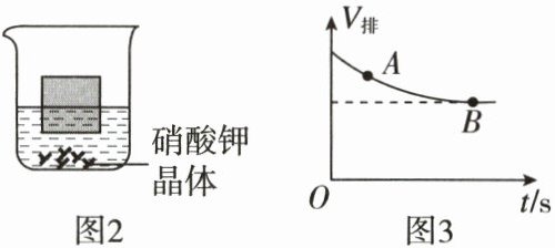 (3)现有一木块漂浮于40 ℃的硝酸钾饱和溶液中(如图2所示),当温度改变时(不考虑由此引起的木块和溶液的体积变化),木块排开液体的体积V排随时间t发生了图3所示的变化。