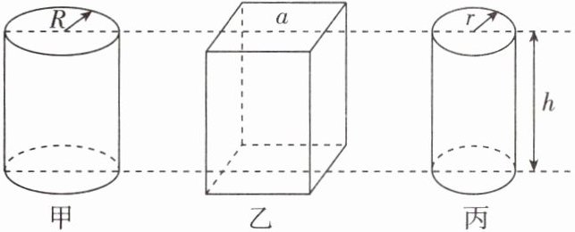 10. 如图所示,在水平桌面上竖立着三个实心匀质柱状物甲、乙、丙,它们的高度均为h,甲、乙、丙的底面分别是半径为R的圆面、边长为a的正方形、半径为r的圆面。已知:$2R>a>2r$,它们对桌面的压强$p_{甲}= p_{乙}= p_{丙}$。关于甲、乙、丙所用材料的密度的大小关系,下列判断正确的是( )