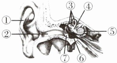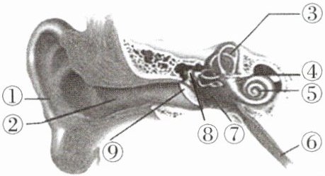 6. C 7.(1)① 耳郭 (2)半规管 前庭 (3)② 外耳道 ⑨→⑧→⑤ (4)⑥ 咽鼓管 (5)咽鼓管 鼓膜