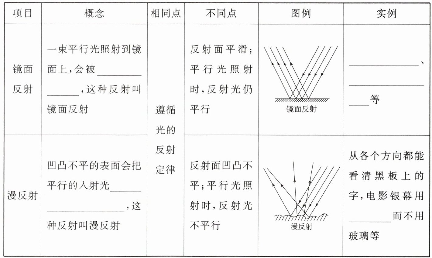 |漫反射|凹凸不平的表面会把平行的入射光______,这种反射叫漫反射|反射面凹凸不平;平行光照射时,反射光不平行||从各个方向都能看清黑板上的字,电影银幕用______而不用玻璃等|