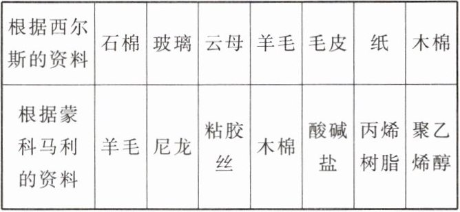 | 根据西尔斯的资料 | 石棉 | 玻璃 | 云母 | 羊毛 | 毛皮 | 纸 | 木棉 |