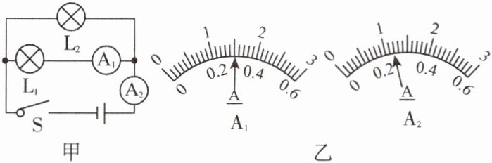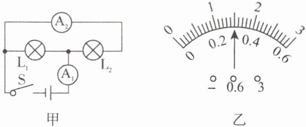7. 图甲所示的电路中,当开关S闭合后,电流表的指针偏转如图乙所示,其中电流表$A_{1}$测量的是通过______(填“干路”“$L_{1}$”或“$L_{2}$”)的电流,电流表$A_{2}$的读数______(填“大于”“小于”或“等于”)电流表$A_{1}$的读数,电流表$A_{2}$的读数应为______A。
