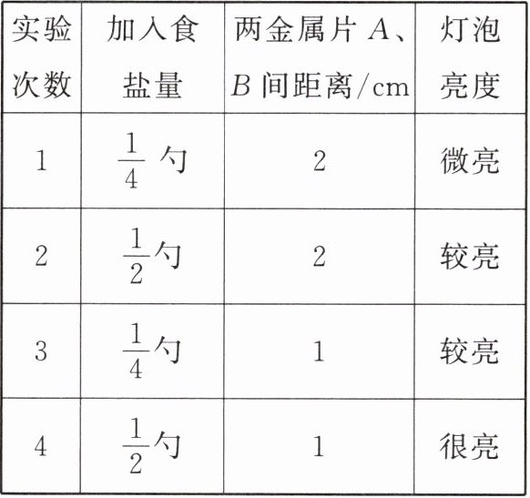 | 实验次数 | 加入食盐量 | 两金属片A、B间距离/cm | 灯泡亮度 |
