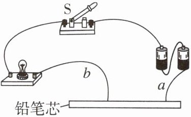 7. 如图所示,导线a的一端固定连接在铅笔芯上,闭合开关S,当导线b的一端在铅笔芯上左右移动时,灯泡的亮度会发生变化,这个实验说明铅笔芯是______(填“导体”或“绝缘体”),还能说明导体的电阻与______有关。受此启发,人们制造了一种可以改变电阻的元件,叫______。