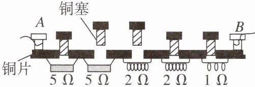 11. 实验室有一种拔插式变阻器,其结构如图所示。六个铜片依次排开,每相邻两个铜片间用不同阻值的定值电阻或电阻丝相连接,五个铜塞均可在相邻两铜片间的空隙处自由插入或拔出,从而改变A、B间的电阻值。