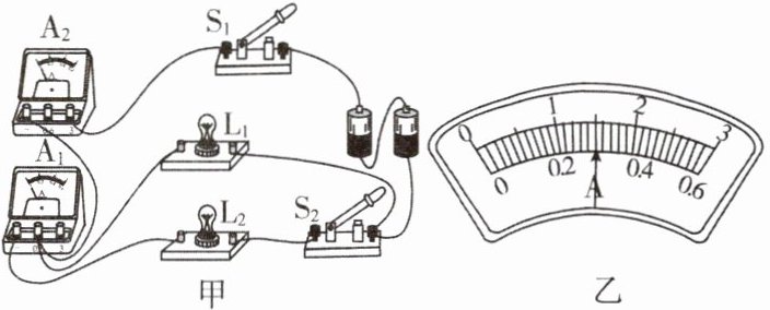 7. 图甲所示的电路,开关$S_1、$$S_2$闭合后,两个电流表指针偏转情况均如图乙所示,则灯泡$L_1$和$L_2$中的电流分别为______A、______A,此时$L_1、$$L_2$两端的电压分别为$U_1、$$U_2,$则$U_1∶U_2=______。$