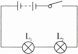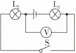 6. 某同学连接的电路如图所示,他所用的电源是四节新干电池串联组成的电池组,当他将开关闭合后,电压表的示数为2 V,则$L_1$两端的电压为$______V,L_2$两端的电压为______V。