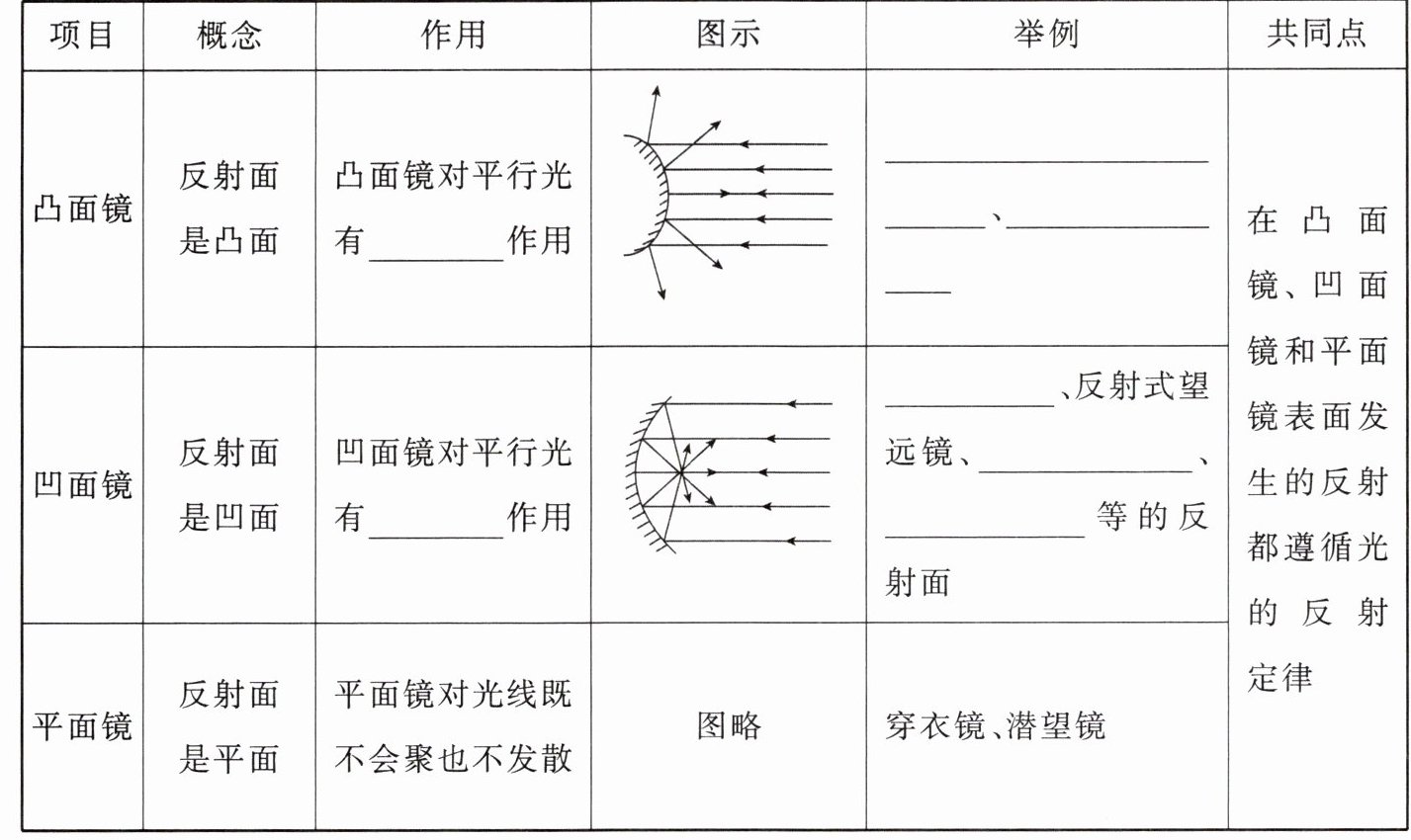 |凸面镜|反射面是凸面|凸面镜对平行光有______作用||______、______、____|在凸面镜、凹面镜和平面镜表面发生的反射都遵循光的反射定律|