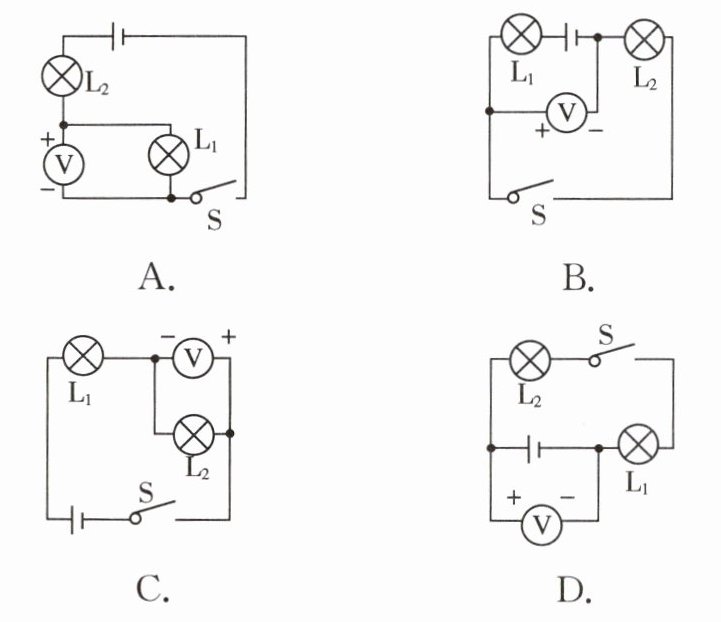 6. 用电压表测灯泡L2两端的电压,下列正确的电路图是( )