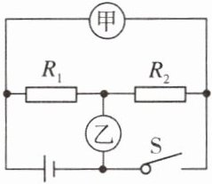 9. 下图所示的电路中,当开关S闭合后,要使电阻R1、R2串联,甲、乙应该接入的是( )