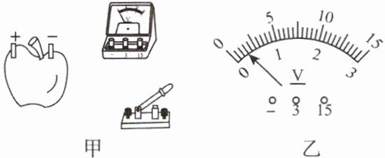10. 科学探究:苹果电池的电压大小U与电极插入苹果的深度h的关系。在苹果中插入铜片和锌片,就能自制成一个苹果电池,铜片是电池的正极,锌片是电池的负极。那么,苹果电池的电压大小与电极插入苹果的深度有怎样的关系呢?某实验小组用图甲所示的实验器材对该问题进行探究。