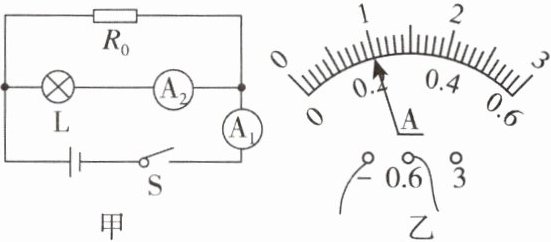 5. 在“用电压表和电流表测导体的电阻”实验中,因缺少电压表,小扬利用两个电流表和一个已知阻值为5Ω的电阻R₀,同样测出了小灯泡的电阻(小灯泡电阻不随温度变化),原理如图甲所示。 小扬读出电流表______(填$“A_1”$或$“A_2”)$的示数为0.5A,而电流表______(填$“A_1”$或$“A_2”)$的示数如图乙所示,则小灯泡L两端的电压为______V,小灯泡L的电阻为______Ω。