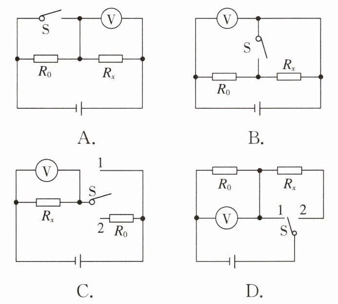 7. 某同学在没有电流表的情况下,利用电压表和已知阻值的定值电阻R₀,测量未知电阻Rₓ的阻值,下列不能实现测量Rₓ阻值的电路图是( )
