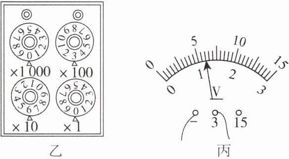 (2)把电阻箱的阻值调至图乙所示,此时电压表的示数如图丙所示。 根据测量的数据可知,电源电压U= ______V,电阻箱的读数是______Ω,电压表的示数是______V,根据这组数据可求出未知电阻Rₓ的阻值是______Ω。