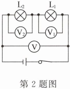 2. 科学实验小组连接了下图所示的电路,电压表V的示数是$3.8 V,V_1$的示数是2.3 V,则$V_2$的示数应为 ( )