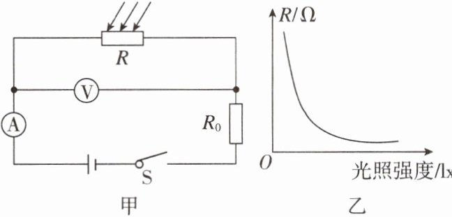 9. 图甲电路中,电源电压恒定不变,R₀为定值电阻,R为光敏电阻,其阻值随光照强度变化的图像如图乙所示。闭合开关,逐渐增大光照强度时,下列说法正确的是 ( )