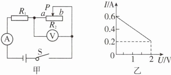 7. 图甲所示的电路中$,R_1$为定值电阻$,R_2$为滑动变阻器,电源电压不变。闭合开关S后,滑片P从a端移动到b端,电流表示数I与电压表示数U的变化关系如图乙所示,则电源电压为$______ V,R_2$的最大阻值为______ Ω。