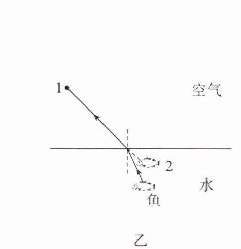 4. 岸上观鱼:如图乙所示,由于光的折射,水中的鱼反射的光从水中斜射到空气中时,折射角______入射角,人眼看到的光在水中的反向延长线形成的鱼的像比鱼的实际位置要浅一些。