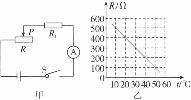 【例4】随着社会的发展和科技的进步,电路元件得到广泛的应用,热敏电阻就是其中之一,热敏电阻的阻值会随温度的改变而改变。图甲是用热敏电阻测量环境温度的电路,电路中电流表的量程为0~0.02 A,滑动变阻器R的铭牌上标有“150 Ω 0.3 A”字样。$R_{t}$为热敏电阻,其阻值随环境温度变化的关系如图乙所示,电源电压保持不变。请回答下列问题。