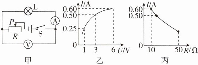 如图甲所示,电源电压保持不变,小灯泡L允许通过的最大电流为0.6 A。滑动变阻器R的最大阻值为50 Ω,电流表量程为“0~0.6 A”,电压表量程为“0~15 V”。闭合开关S,在保证电路安全的前提下,最大范围调节滑动变阻器的滑片P,利用所得数据绘制了电流表示数与电压表示数、电流表示数与滑动变阻器R连入电路阻值的变化关系,如图乙、丙所示。