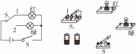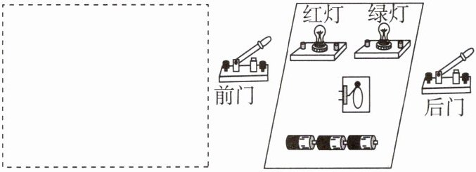 变式1 某传达室需要在前、后门都装上开关。前门有人按开关时,要求传达室电铃响,同时红灯亮;后门有人按开关时,传达室电铃响,同时绿灯亮。请按需要设计电路图并在虚线框中画出电路图,把实物连接成电路。