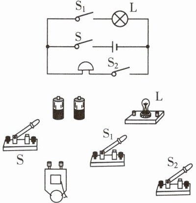 【例2】根据电路图连接实物电路。$(S_1$为单刀双掷开关,可以分别与1、2两触点接通)
