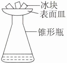 11. 小明为模拟大自然中“雨”的形成做了如图所示的实验。向锥形瓶中注入少量的温水,稍后,取一干燥的表面皿盖在瓶口,在表面皿中放置一些冰块,一段时间后,瓶内出现朦胧的“白雾”,表面皿底部看到有小水滴,且小水滴逐渐变大,最终降落到瓶内。