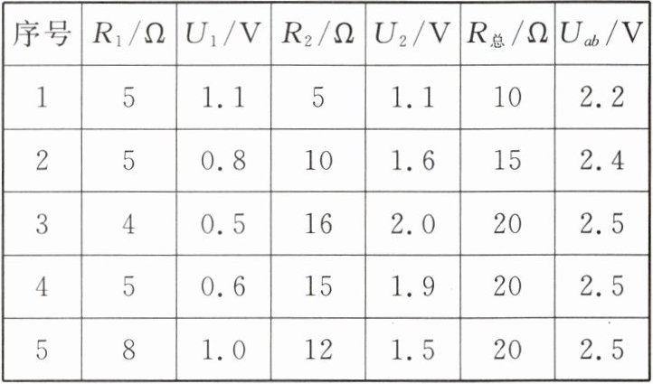 | 序号 |$ R_1/Ω $|$ U_1/V $|$ R_2/Ω $|$ U_2/V $| R总/Ω | Uab/V |