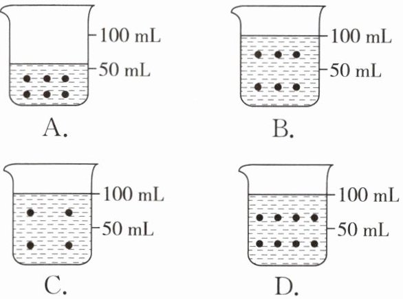4. 建立模型是解决问题的一种方法。下图烧杯中盛有50 mL的蔗糖溶液,其中“•”表示所含的蔗糖分子。在该溶液中加入一定量的水,下列能表示稀释后蔗糖溶液模型的是( )
