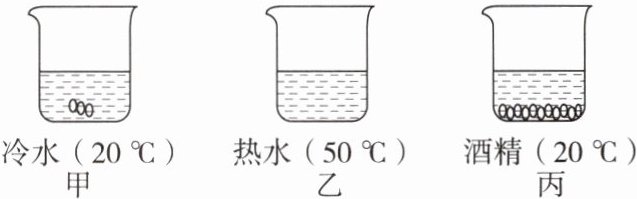 7. 小燕同学探究影响物质M溶解性的因素,操作如下:取三只烧杯,分别加入10 g冷水、热水和酒精,然后各加入5 g物质M,充分搅拌后出现图甲、乙、丙所示的现象。请据图回答问题。