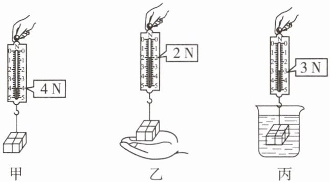 (3)将物体浸没在水中,如图丙所示。对照丙与甲、乙实验,说明______对______也有向上的托力,即浮力。水对浸入其中的该物体的浮力$F_浮$=______N。